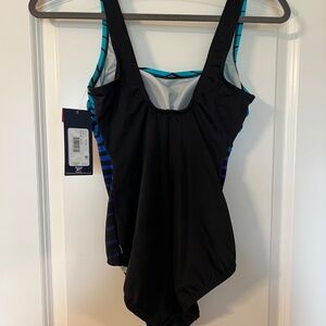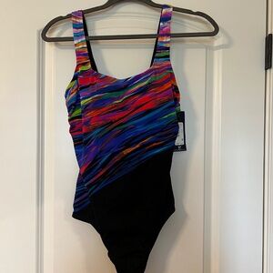 Vibrant and flattering one-piece swimsuit. Features a bold, multicolor abstract print with a slimming black bottom and a high neckline for sleek, comfortable coverage. Perfect for pool days, beach trips, or resort getaways — supportive, stylish, and confidence-boosting!
