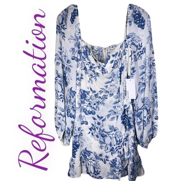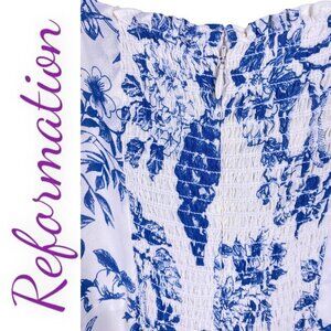 NWT REFORMATION Cammi Ruffle Smocked Mini Dress In Corsica Blue Floral Print, 8