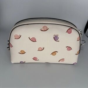 Elegant Coach cosmetic bag in cream. Features vibrant swirl patterns. Ideal for stylish organization.