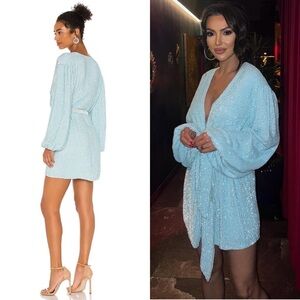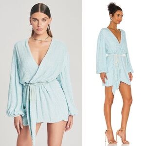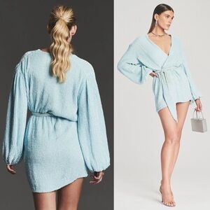NWT RETROFETE Hand Stitched Baby Blue Sequin Long Sleeve Tie Waist Wrap Dress XS