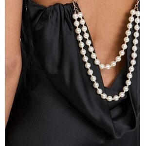 The Electra Dress is an elegant silhouette crafted with a cowl neckline and a seductive low back. The sexy maxi is enriched with pearl strap, combining both allure and class. The dress is finished with an invisible zipper down the side. Shown here in Black 72% Acetate, 28% Polyester