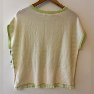 New with partial tag Revolve Duffy 100% cashmere lime green and off white/cream striped super soft 100% cashmere fringe hem sleeveless sweater. Loose boxy fit. Trendy, casual, cozy, quiet luxury. (M)