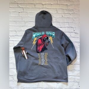 Full zip jacket with hood, Drawstring, Long sleeves, Pockets, Graphic front and on sleeve. Large world tour graphic on back.