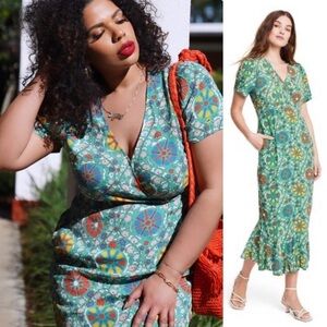 NWT RHODE x Target Zinnia Floral Print Short Sleeve Midi Dress Green/Red/Yellow. Adorned with allover zinnia print in red and yellow on a green backdrop, this midi dress is designed with a V-neckline, short sleeves, side pockets and a flared hemline. It has a flowy drape and is made of lightweight, breathable fabric for comfortable wear. *Sold Out Best Seller*