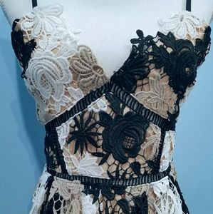 New with tag Romeo and Juliet Couture. Multicolored floral lace dress makes an on-trend statement. Plunging V-neck. Adjustable spaghetti straps. Empire waist. Pleated skirt. Squareback. Exposed back zip closure. Polyester lining. Hand wash. Color in Beige, black and white.