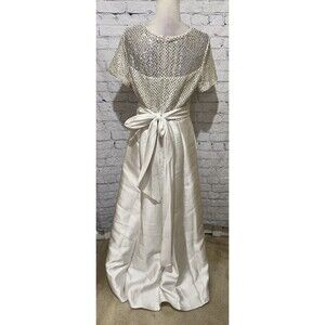 NWT R&M Richards White Short Sleeve Sequin Satin Bow Hi Low Formal Dress Gown 10