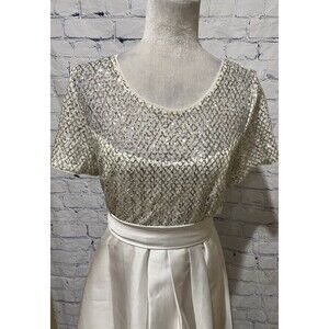 The NWT R&M Richards White/ivory Short Sleeve Sequin Satin Bow Hi Low Formal Dress Gown in size 10 is a sophisticated and elegant option for a formal occasion. Made of polyester and spandex, the dress features a crew neckline, short sleeves, and a zip closure. The ivory color and satin fabric add a touch of luxury, while the bow and sequin accents give it a touch of glamour. This A-Line dress is perfect for all seasons, whether it's winter, summer, fall, or spring. 20 inches pit to pit, 30 inch waist and 43 to 60 inches long. Smoke free home.