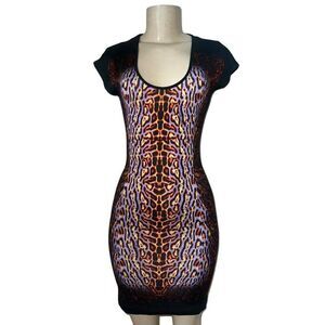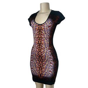 Flaunt a cool look by wearing this stylish dress from Roberto Cavalli. Crafted using viscose and elastane, it features animal printed jersey with black back, scoop neck, short sleeves, and mini length hem. Wear this dress and look your best.