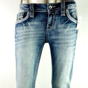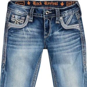 ~*~ROCK REVIVAL~*~ "KAMEA" SKINNY BLING JEANS SIZE 28 BRAND NEW approx. Measurements laying flat: 15" wide x 9" front rise x 30" long HAVE STRETCH COMPLETELY SOLD OUT!!! MSRP $189.00 + tax!!! THICK WHIP STITCH FLEUR OPEN POCKETS, LEATHER EMBROIDERED, HEAVY METALLIC SILVER THREADING & RHINESTONE BLING Zip fly with button closure 5 pocket construction Distressed, fading, and whiskering detail Skinny leg 98% cotton, 2% elastane