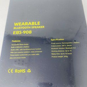 NWT (FACTORY SEALED) ROHS EBS-908 WEARABLE/PORTABLE AROUND THE NECK BLUETOOTH SPEAKER BLACK FEATURES: - AROUND THE NECK DESIGN - BUILT IN 600MAH LI BATTERY - BUILT IN MIC, WITH HANDFREE PHONE FUNCTION - WITH 2 PIECES PASSIVE RADIATORS, BASS ENHANCED - THREE BUTTON CONTROL LET'S YOU MAKE CALLS - PLAY AND PAUSE TRACKS SPECIFICATION: - POWER SOURCE: RECHARGABLE LI BATTERY - OUTPUT POWER: 3W*2, STEREO - BLUETOOTH SOLUTION: BLUETOOTH 5.0 - MPLAY TIME: UP TO 10 HOURS - PRODUCT WEIGHT: 24.3G