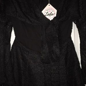 Beautiful black lace romper I bought from a boutique ! Cute cut out in front that ties and reveals the mid stomach. Sleeves are bell sleeves. Never worn. Size M