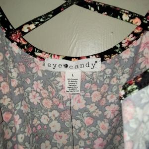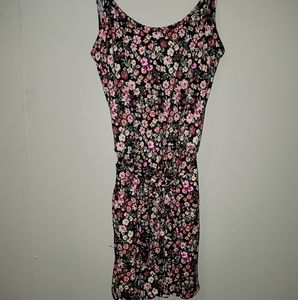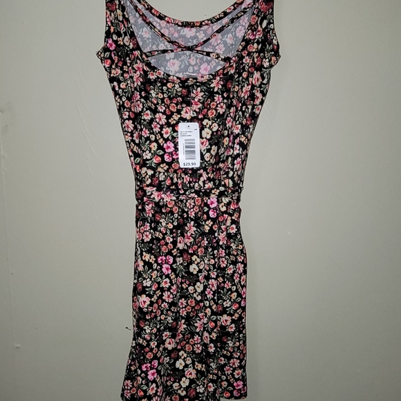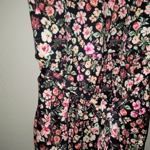 black with colorful floral romper. comes with cloth belt to cinch waste. very soft stretchy material. spaghetti straps with criss cross back. purchased from a boutique!