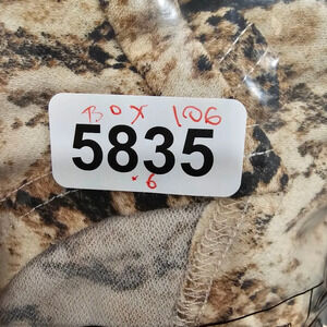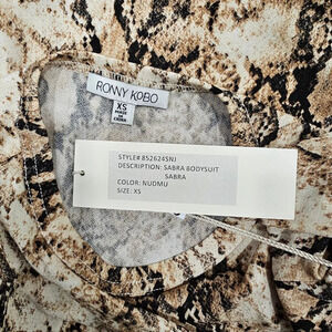 This is a new with tags and box, Ronny Kobo, Sabra Bodysuit in size XS. The bodysuit is made of a stretchy, lightweight fabric with a snakeskin print in shades of brown and black. It features a round neckline, long sleeves, and a snap closure at the crotch. The bodysuit is fully lined with black fabric. The bodysuit is in excellent condition with no visible imperfections.