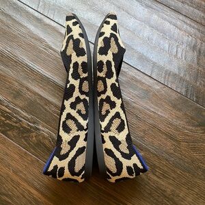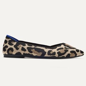 Stylish leopard flats by Rothy's. Comfortable and versatile. Ideal for casual wear. Premium knit upper in a black and cream leopard print with a smooth, refined shape.