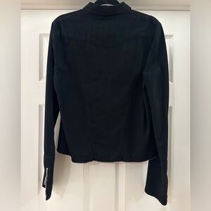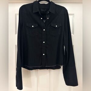 New with tags. RTA Road To Awe Ashley Western Shirt Pearl Snap Collared Black. Size small. White snap button closure at front. Zipper detail at cuffs.