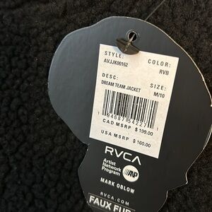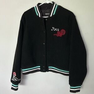 NWT RVCA Dream Team Bomber Jacket/coat, women’s size medium. Black with embroidered designs, rainbow and Love on back of jacket. Green and white bands at waist and wrists.