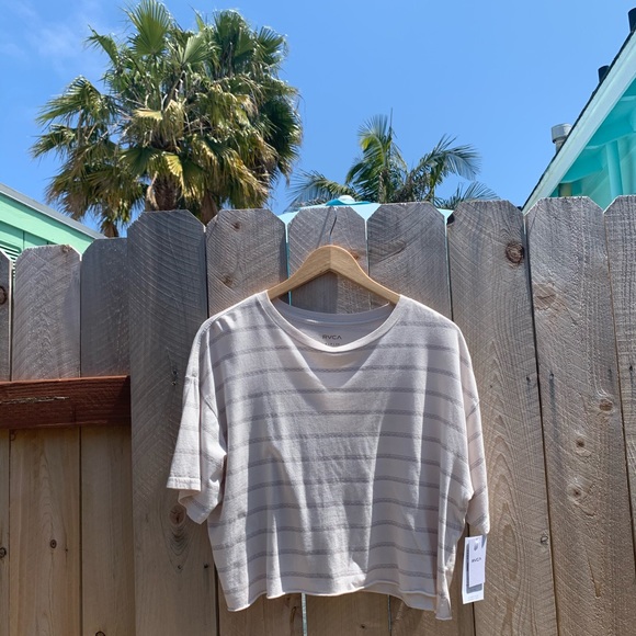 Brand new RVCA “Vava Stripe” Tee! Summer beach vibe perfect with cute bikini bottoms! Off white with light purple V pattern.