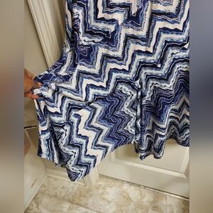 Stylish midi dress with bold zigzag design. Features blue and white hues. Ideal for any occasion.
