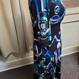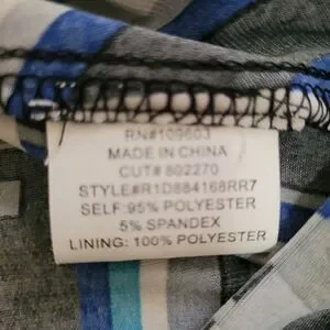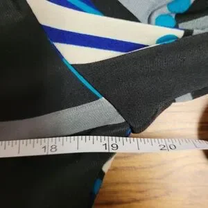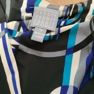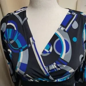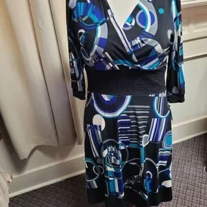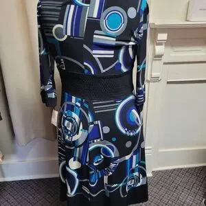 Size 14, 19" PTP, 36" long, Blue and black abstract designed print. 3/4 length sleeves. Empire waist, sinched elestic, figure flattering. V-neck. Very pretty! Ready for Spring and Summer. NWT