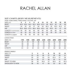 Sizing tips: Every designer cuts their dresses differently & according to their size chart. Please measure yourself (in inches) before ordering & follow our size chart (pictured under the main dress picture). If you are in between sizes or unsure of the fit, choose a size up, as it is easier for your seamstress to take in rather than out. Please refer to the size chart in our images section.