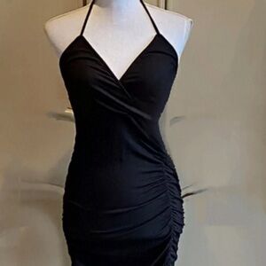 anymore, Rachel Pally, made in the glamorous USA, very comfortable, stretch bodycon material, surplice neck, adjustable halter, ruched on both sides, slight side slit on right side, easy pullover