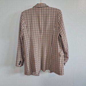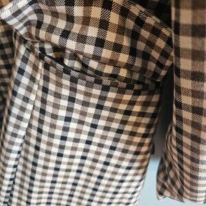 Rachel Zoe brown plaid double-breasted open blazer, women’s size Large. This oversized jacket features a timeless tan and brown plaid print with a double-breasted design that gives it a polished look—without an actual closure for that effortless, draped fit. It has two front flap pockets, a single back vent, and is fully lined for structure and comfort. Crafted from a polyester blend with no stretch, it’s best cared for with dry cleaning. EUC