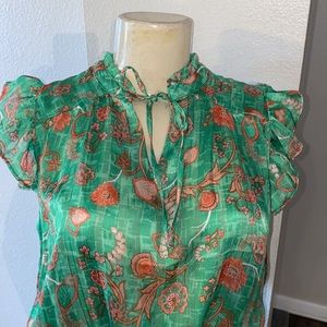 NWT Rachel Zoe Floral Print Top Green & Orange Ruffle Sleeve Caps Tie neck Smocked bottom Light Weight 100% Polyester