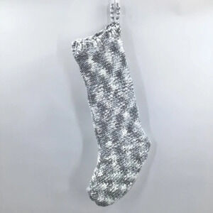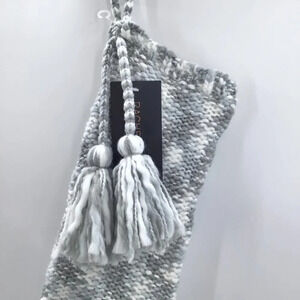 Brand new Christmas stocking by Rachel Zoe. It is knit from variegated yarn for an ombre effect in muted blue, white, and gray colors and there are two large tassels attached to the cuff.