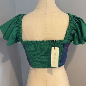 New with tags, Rachel Zoe Ruffle Shoulder Crop Top Size XS. Abstract print with stretch back, ruffled sleeves with ruffle detailed edging. 55% linen and 54% rayon - hand wash cold. See pictures for length and armpit to armpit measurements.