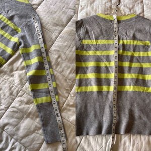 This bright green & grey knit cardigan is by Rachel Zoe. It features V-neckline with ribbed cuffs & trim & shiny silver buttons. Front welt pockets with buttons.