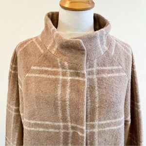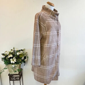 Rachel Zoe Tan Plaid Blanket Car Coat. Features hidden snap closure. Front slant pockets. Stand up collar. Unlined.