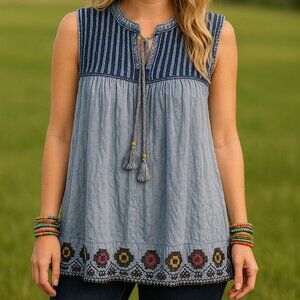 Rachel Zoe Boho Embroidered Sleeveless Blouse Tassel Tie Top - Grayish Blue