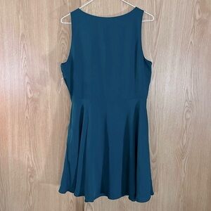 This is a beautiful dress in a shade of dark turquoise with full skirt, sleeveless and lined.