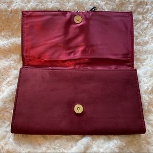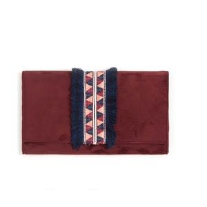 Folkloric-inspired embroidery, framed by lush fringe, lends vintage-boho charm to a sleek faux-suede clutch, perfect for carrying small essentials during warm-weather outings.