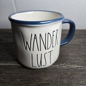 Enjoy your summer adventures with this beautiful Rae Dunn Artisan Wanderlust Coffee Mug. The white ceramic material is adorned with a blue trim design, perfect for any boho-inspired outfit. This coffee mug is suitable for hot beverages and comes with a handle for easy grip.
