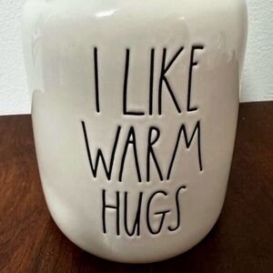 NWT Rae Dunn x Disney collab Olaf canister with lid that features the Frozen character on the lid and the words “I Like Warm Hugs” on the front of the canister.