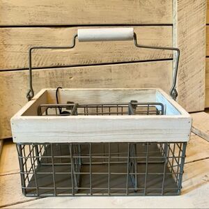 wire and wood Let’s Eat utensil caddy/ holder. Four compartments with handle.
