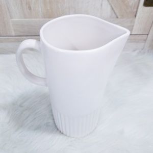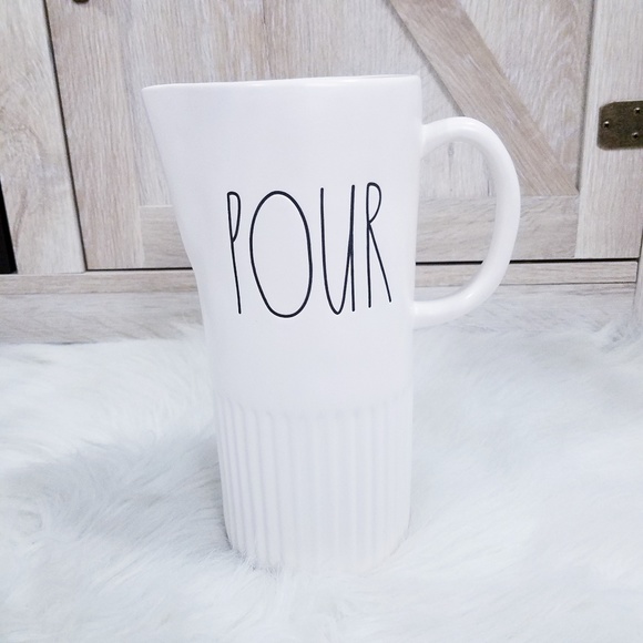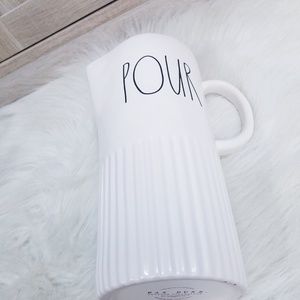 Brand NEW Rae Dunn POUR Pitcher in the NEW 2019 Design Style. A large white porcelain pitcher with classic large black font on the front that says "Pour" and in the brand new design with ridges at the bottom.