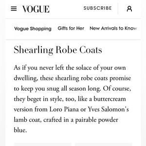 Vogue listed shearling robe coats as one of the must have coats for Winter 2023. Camel is also also the color of the coat color of the season
