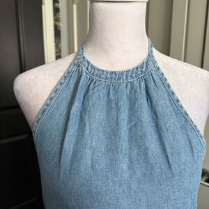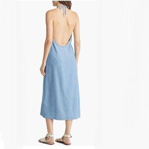 New with tags from favorite denim brand Rag & Bone! The Zoe Halter Dress features a high neckline, relaxed fit, midi length depending on height, low open back, side zipper closure, and made of a breezy lightweight and lighter wash denim chambray cotton. Perfect for a warm weather vacation, easy summer night, or layer with a bomber jacket during the colder months. Excellent brand new condition with a retail price of $350!