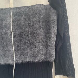 This is the rag and bone w2456618Q black melissa cardigan sweater. It is a chic, incredibly elevated look with a paneled colorblock pattern in black white and gray.