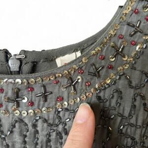 Brand new with tags — this stunning Raga sleeveless shift dress features intricate hand-beaded metallic gunmetal detailing, red and gold sequins, and geometric embroidered accents near the hem. Fully lined with a hidden back zip closure and includes extra beads and sequins. Slight rough spot on collar (see photo), otherwise in flawless unworn condition. A gorgeous art textile piece perfect for parties, festivals, or vintage-inspired looks.