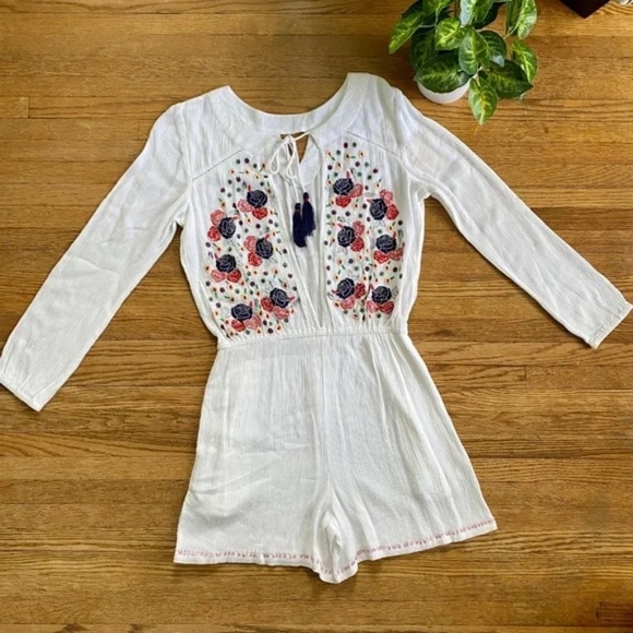 Raga Anthropologie White Embroidered Long Sleeve Romper with Tassel Tie Size Small