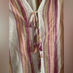Brand new with tags! Rails Brielle top in the cheerful Hibiscus Stripe colorway (pink, orange, green, and white). Lightweight and breezy, made from a soft linen-rayon blend for an effortlessly relaxed fit. Features raglan sleeves, a flattering V-neckline with adjustable tassel ties, and side vents for easy movement.