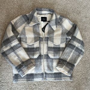 Rails Cheyenne Zip Up Jacket in Gray. Self: 72% polyester 22% wool 4% acrylic Lining: 100% polyester. Front zipper closure. Front breast flap pockets. Buttoned cuffs. Launched in 2006, Rails is a unique brand of fashion fusing California comfort activewear with European styling. High quality fabrics, narrow cuts, and unique lines; this collection is influenced by international travel and metropolitan lifestyle. Color: gray