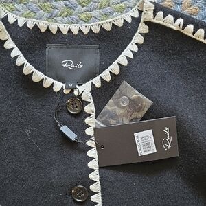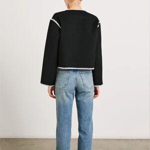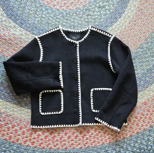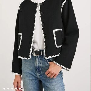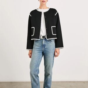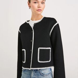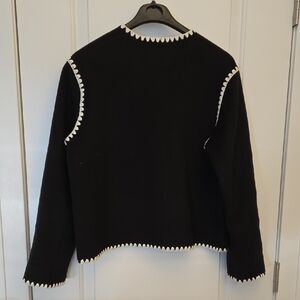 Elegant black jacket with cream detailing. Ideal for versatile styling.