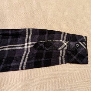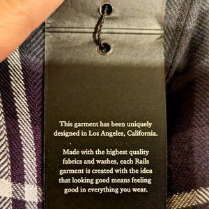 This maternity dress from Rails combines the brand's iconic plaid patterns and supersoft fabric with shirtdress styling. The material, which is 99% rayon, is drapey -- much thinner and sleeker than typical plaid shirts. The plaid is a beautiful mix of black, gray, and white tones, with subtly metallic silver thread intertwined with the white parts. The dress has 9 buttons down the front, all of which work. There's a patch pocket on the front left of the chest. The long sleeves button at the wrist. There's a Rails logo label at the bottom hem, which has a subtly curved shape. The fit is loose and extremely comfortable. There is shirring in the back for shape. NOTE: This dress doesn't come with a belt, but could easily be paired with one. Dress is NWT and will ship with the original tags still attached. Purchased from Pea in the Pod, which has since sold out of this style.