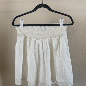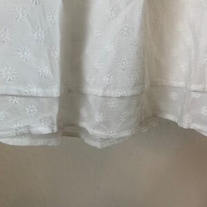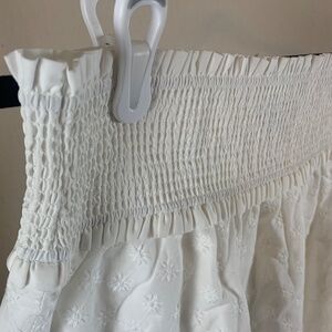 This Rails mini skirt in size XL features a beautiful white embroidered daisy pattern on a crepe fabric with a pull-on closure and elastic waist for a comfortable fit. The ruffled accents and smocked details add a touch of style, making it perfect for both casual and party/cocktail occasions during summer, fall, or spring. The skirt is not only stylish but also lightweight and stretchy, ensuring a flattering fit for any body type. New with tags.