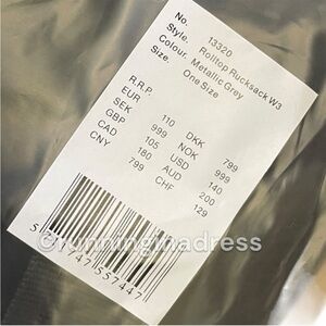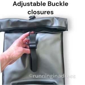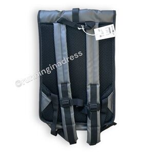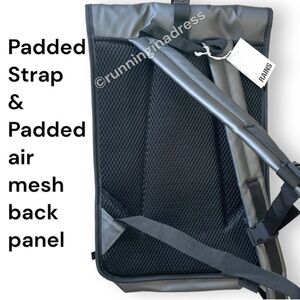 NWT Rains Waterproof Rolltop Rucksack Laptop Backpack In Metallic Grey Unsex bag Version W3. Rolltop Rucksack keeps precipitation out when traveling from point A to Z, making it a city staple that's perfect for commutes on bike or foot. To protect essentials from rain, fold the rolltop into a tight scroll and secure using the signature carabiner. It also features a side-access laptop pocket, front zip pocket and padded back panel.