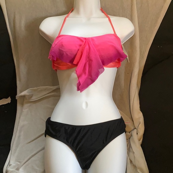 Brand new Raisins bikini. Coral/hot pink tie back top with ruffle detail. Detachable neck strap and removable padding. Black cheeky bikini bottoms, with back rushing . The inside of the bottoms are lined with a parrot print, but they are not reversible. Size medium.